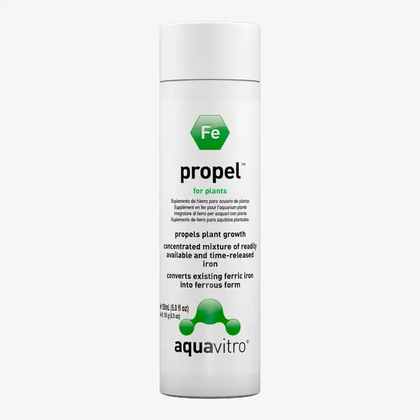 O Aquavitro Propel é formulado com ferro na forma ferrosa, que é facilmente absorvido pelas plantas aquáticas. O ferro é um nutriente crítico para a produção de clorofila e para o processo de fotossíntese. A suplementação regular previne sintomas de deficiência, como folhas amareladas e crescimento lento. Ideal para aquários plantados que necessitam de reforço nutricional.